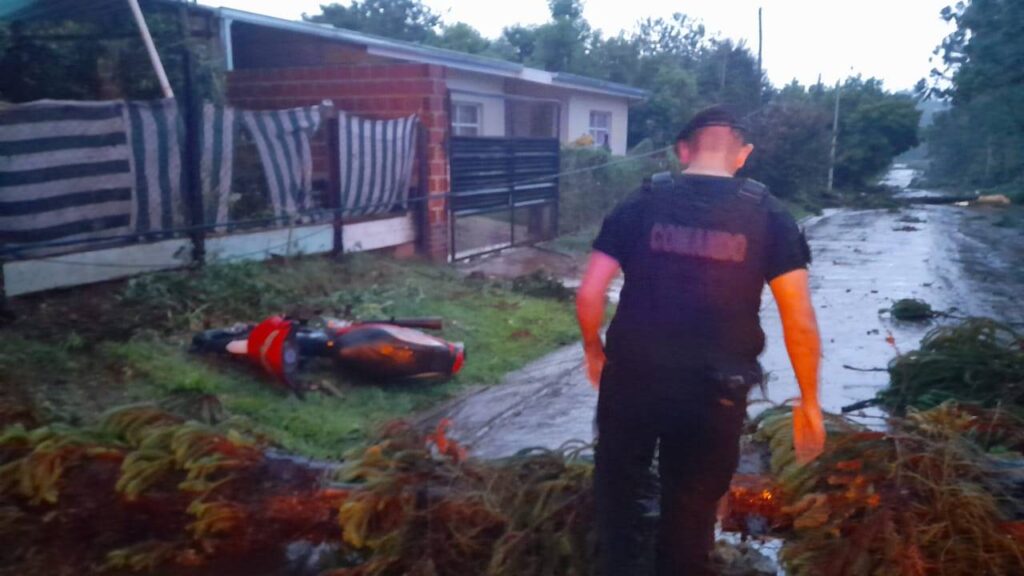 El paso del viento provocó la voladura de techos, caídas de árboles y postes, además de anegamientos repentinos en viviendas de distintos barrios de la ciudad. Por ello, agentes policiales de Alem iniciaron el relevamiento de damnificados junto al personal de bomberos y al municipio, que está utilizando toda su infraestructura.