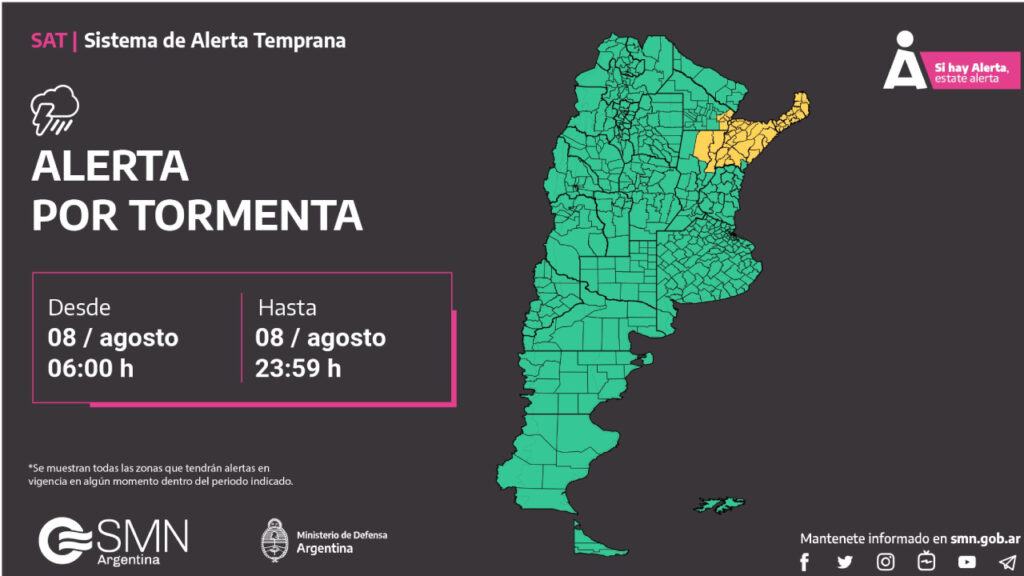 En el comunicado emitido por por el SMN se indicó que las provincias del litoral se encuentran bajo alerta amarillo por tormentas que llegan acompañadas de fuertes vientos, actividad eléctrica, abundante caída de agua y posibilidad de granizo.