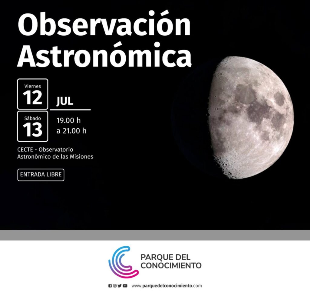 Hoy y mañana 13 de julio, de 19 a 21h, el Observatorio Astronómico de las Misiones abrirá sus puertas al público para realizar observaciones desde el telescopio y tomar fotografías de la luna. El ingreso es libre y sin reserva previa. La actividad está sujeta a las condiciones climáticas.