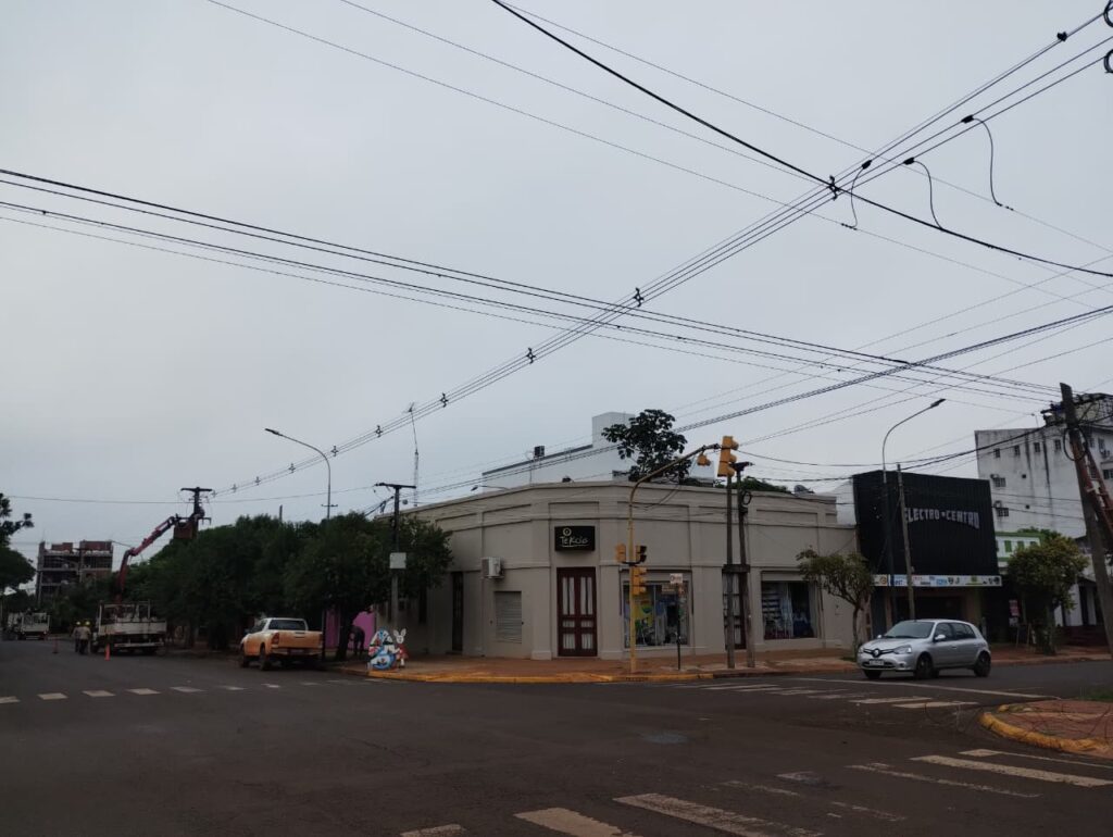 Energía de Misiones avanza con trabajo en Apóstoles, con el tendido de una nueva línea de media tensión sobre la Avenida Sarmiento, entre las calles Alvear y Las Heras.