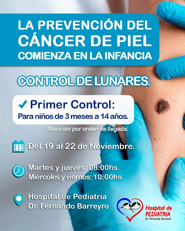 En el marco de la 31º Campaña Nacional de Prevención del Cáncer de Piel, el Servicio de Dermatología del Hospital de Pediatría Dr. Fernando Barreyro ofrecerá atención especial para el primer control de lunares en niños, de 3 meses a 14 años (no deben tener evaluaciones anteriores).