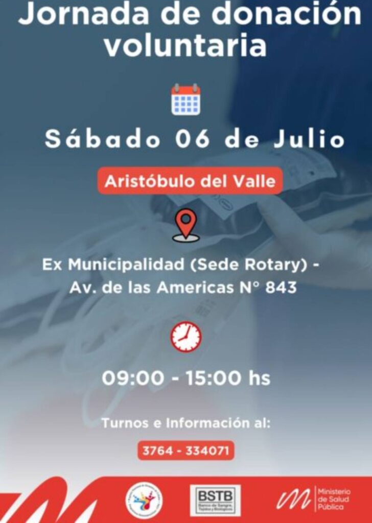 - Aristóbulo del Valle: sábado 6, ex Municipalidad (sede Rotary) de 9 a 15 horas.