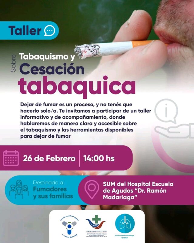 En el marco de las acciones de promoción y prevención de la salud, el Hospital Escuela de Agudos “Dr. Ramón Madariaga” realizará un taller sobre tabaquismo y cesación tabáquica destinado a fumadores y sus familias. La actividad se llevará a cabo el jueves 26 de febrero a las 14 horas, en el SUM del hospital.