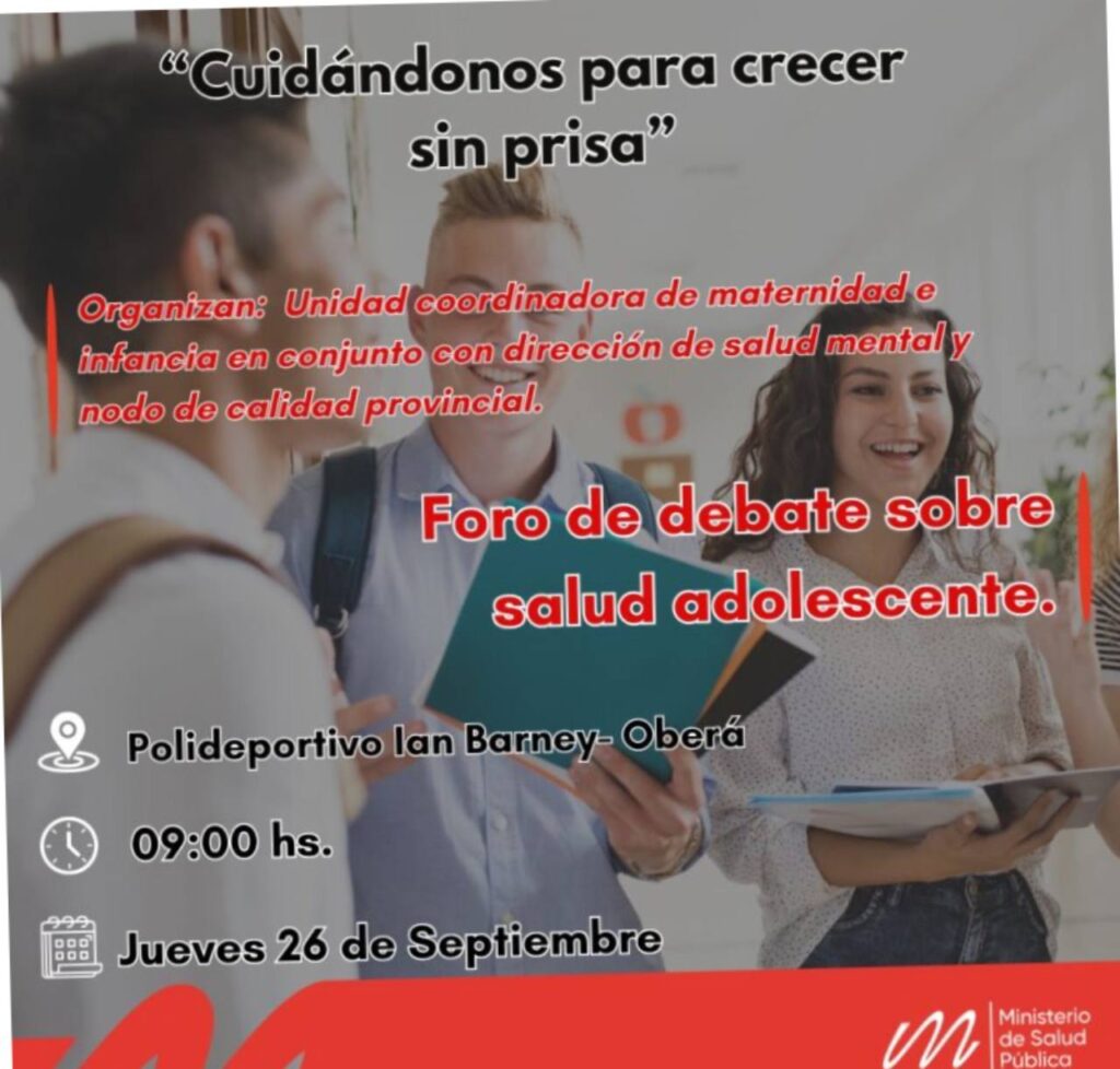 Adolescentes misioneros participarán del foro de debate sobre Salud Adolescente “»Cuidándonos para crecer sin prisa», el próximo 26 de septiembre en el Polideportivo Ian Barney de Oberá, desde las 9 horas.
