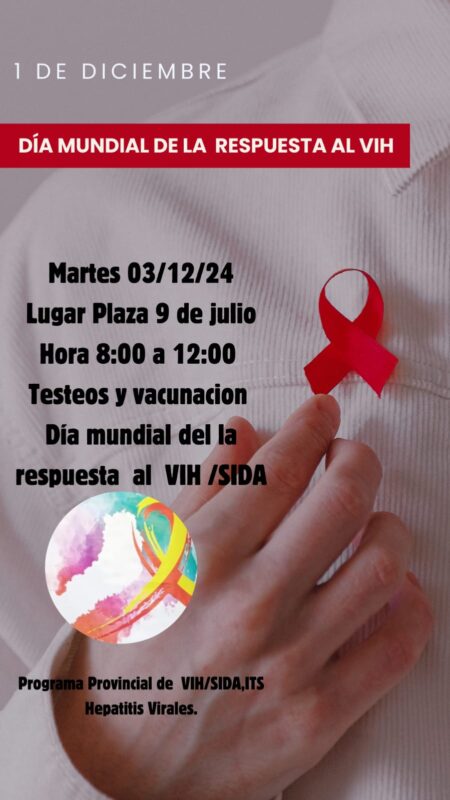 En ese sentido, el martes 3 de diciembre, en que también se celebra el día del médico, el Programa Provincial de VIH-SIDA, ITS y Hepatitis Virales del Ministerio de Salud Pública, realizará una jornada de promoción y prevención a la comunidad en la plaza 9 de Julio, de 8 a 12 horas brindando testeos rápidos para VIH y vacunación.