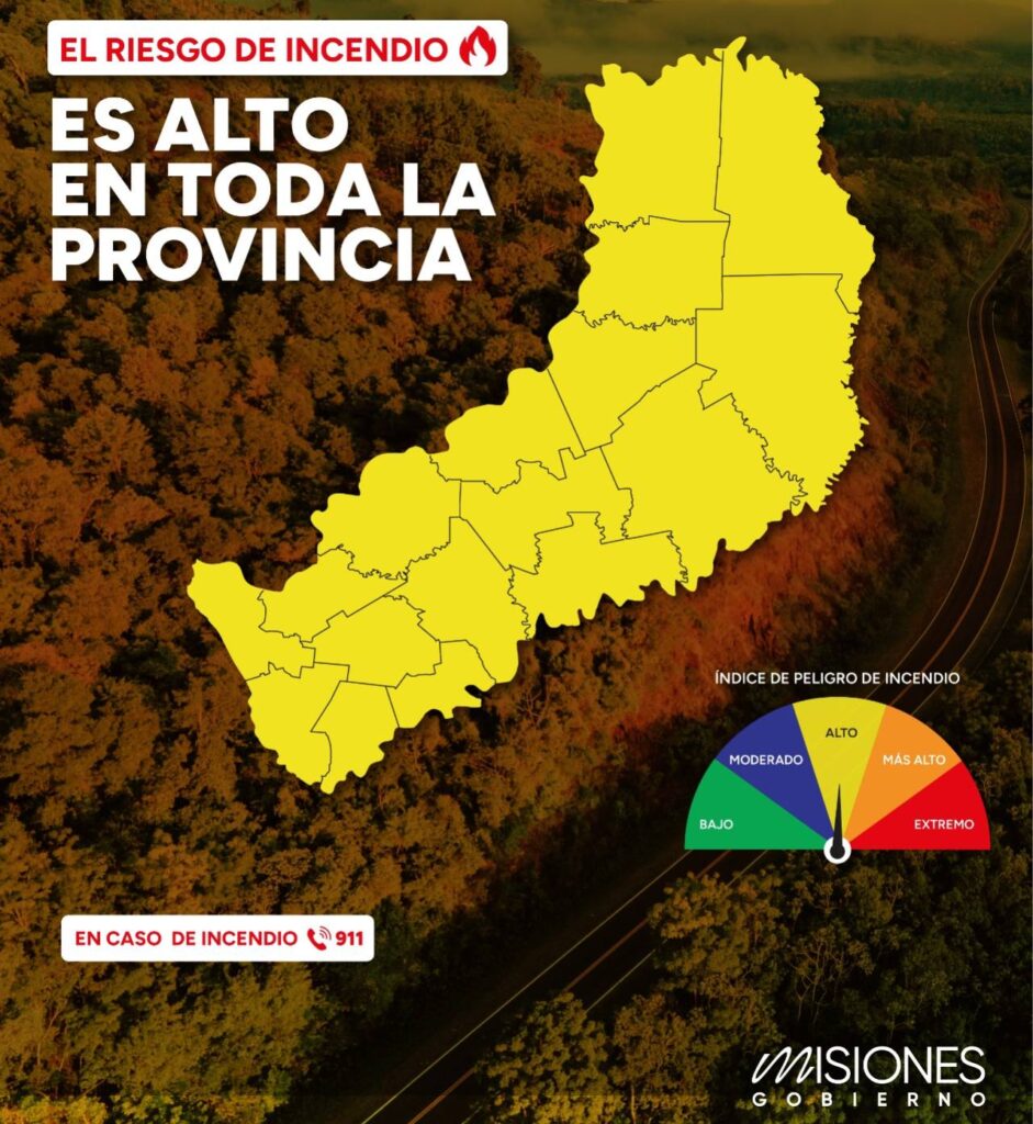 Esta mañana, la Dirección de Alerta Temprana informó que toda la provincia de Misiones se encuentra bajo la categoría de riesgo “ALTO” de incendios, lo que implica un escenario propicio para la propagación del fuego debido a las condiciones climáticas.
