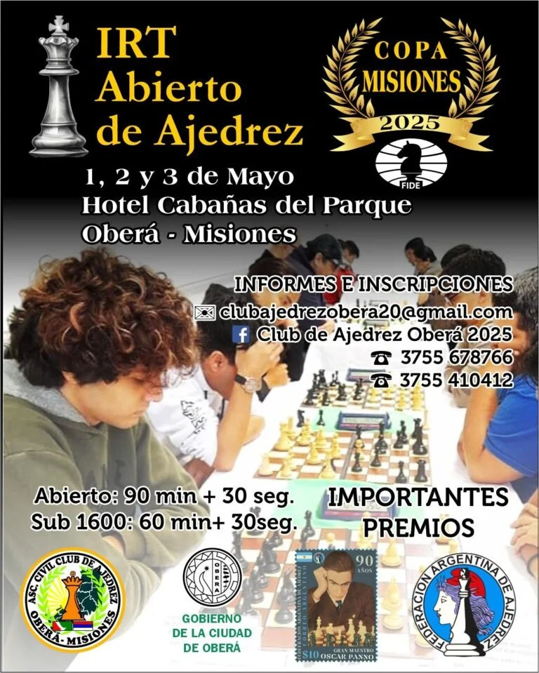 El IRT de Ajedrez “Copa Misiones” se desarrollará los días 1, 2 y 3 de mayo. El jueves 1 de mayo se producirá el inicio del torneo a las 13h (primera ronda) y continuará a las 19:30.