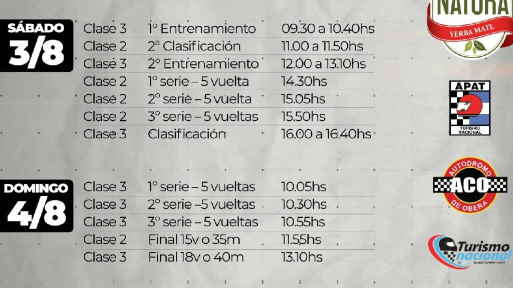 La Asociación Pilotos Automóviles Turismo (APAT) y el Automóvil Club Oberá (ACO) llevarán adelante la presentación del Gran Premio Yerba Mate Natura, válido por la octava fecha del Campeonato 2024 de Turismo Nacional, que se disputará el fin de semana en el autódromo Ciudad de Oberá.