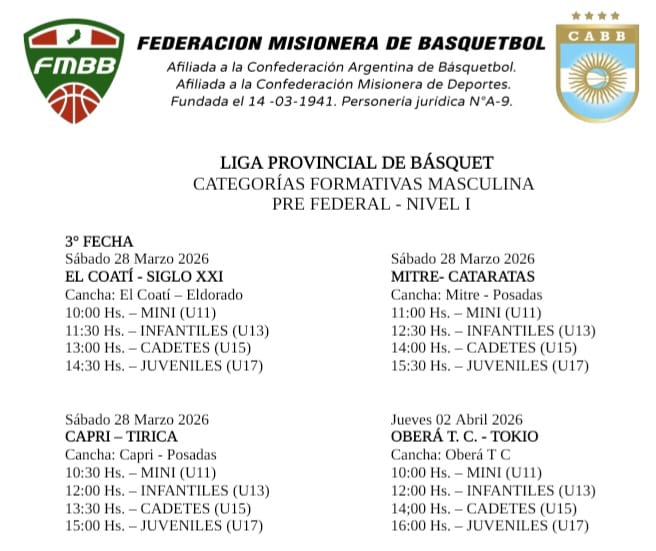La Federación Misionera dio a conocer los cotejos correspondientes a la tercera fecha de las distintas categorias formativas que despliegan la actividad por distintos puntos del territorio provincial y que brindan a cientos de chicos la posibilidad de demostrar en el rectángulo de juego todo lo aprendido en las prácticas, con el respaldo innegable de técnicos, dirigentes y fundamentales las familias.