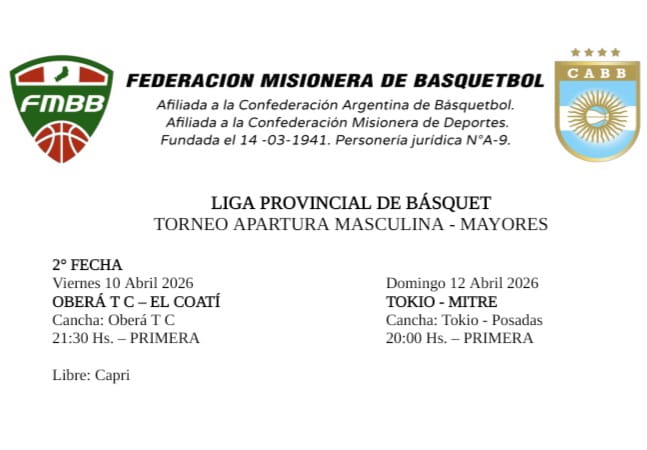 Con el debut de Oberá Tenis Club -tuvo fecha libre en el inicio del torneo- recibiendo en el Derna a El Coatí hoy a las 21: y el clásico posadeño que se jugará el domingo desde las 20 en el Jorge Rokuro Yamaguchi, se desarrollará la segunda fecha del campeonato provincial de básquetbol, organizado por la Federación Misionera, que en esta oportunidad tienen sólo cinco participantes. En esta oportunidad tendrá fecha libre Capri.