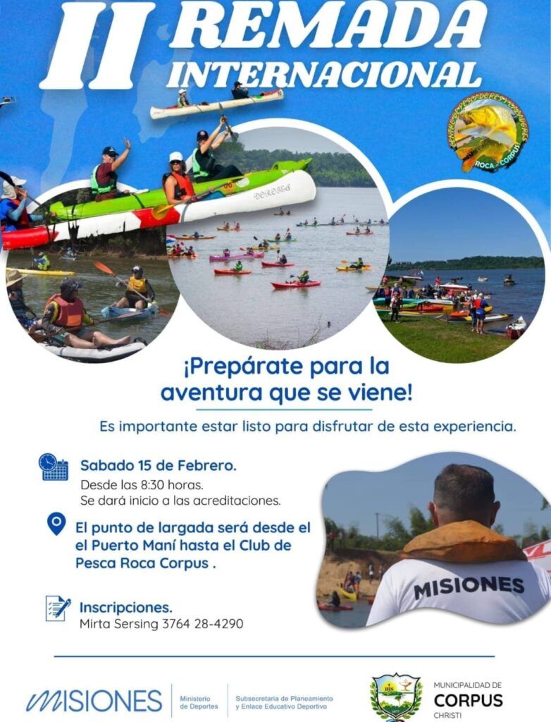 La Municipalidad de Corpus Christi junto Subsecretaria de Planeamiento y Enlace Educativo-Deportivo del Ministerio de Deportes, Noelia Leyria y Wildo Galo Bernal, están organizando la segunda remada internacional con la participación de embarcaciones de distintos puntos de Misiones y provincias cercanas y localidades vecinas del Paraguay.