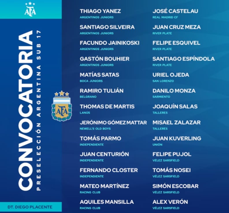 El plantel incluye jóvenes de clubes argentinos y una figura internacional: el arquero José Castelau, nacido en España y jugador de las inferiores del Real Madrid.