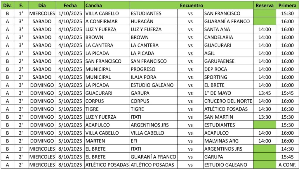 Además, se programaron dos encuentros pendientes de la segunda fecha para el miércoles 8 de octubre: Guaraní Antonio Franco recibirá a Garupá y Atlético Posadas será local ante Estudio Galeano.