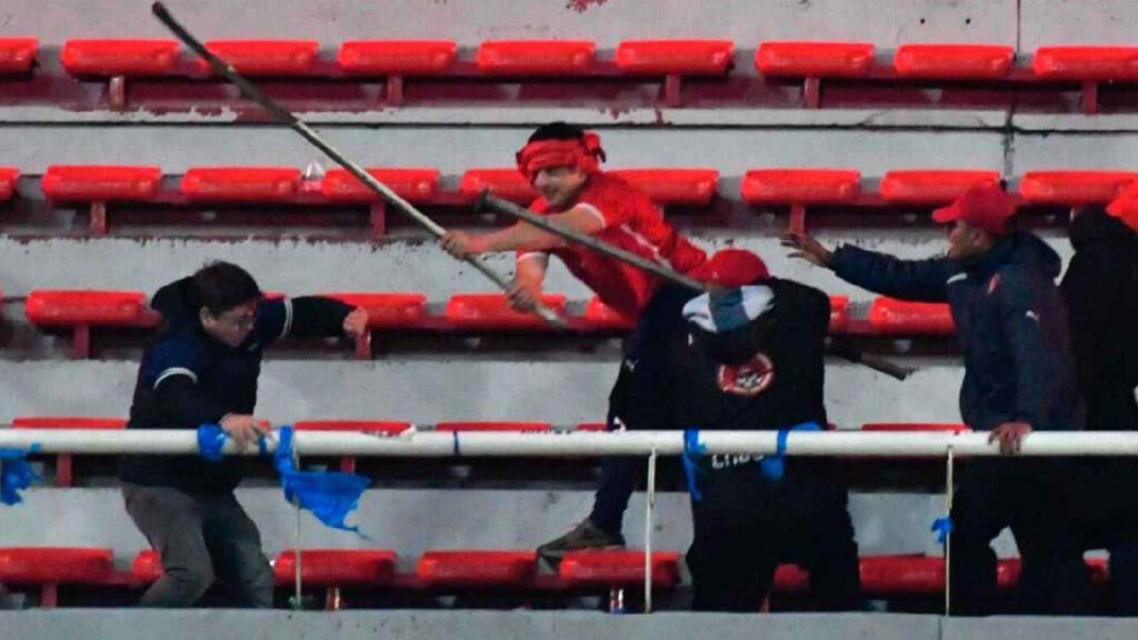 Según lo reportado por la transmisión oficial, simpatizantes chilenos forzaron el acceso a sectores restringidos, provocaron destrozos en baños, arrancaron asientos y utilizaron estos elementos como proyectiles, junto con palos de escoba y botellas. Las agresiones se dirigieron a hinchas de Independiente ubicados en las bandejas inferiores, y se sumaron incendios de butacas y el lanzamiento de bombas de estruendo.