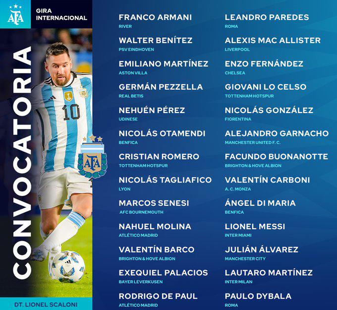 Sobre un total de 26 convocados, el «Colo» Barco surgió como la gran novedad. El ex Boca Juniors y actual Brighton And Hove de Inglaterra, encontró su gran chance ante la dolencia del defensor campeón del mundo Marcos Acuña, afectado por una lesión miofascial en el recto anterior del muslo izquierdo.