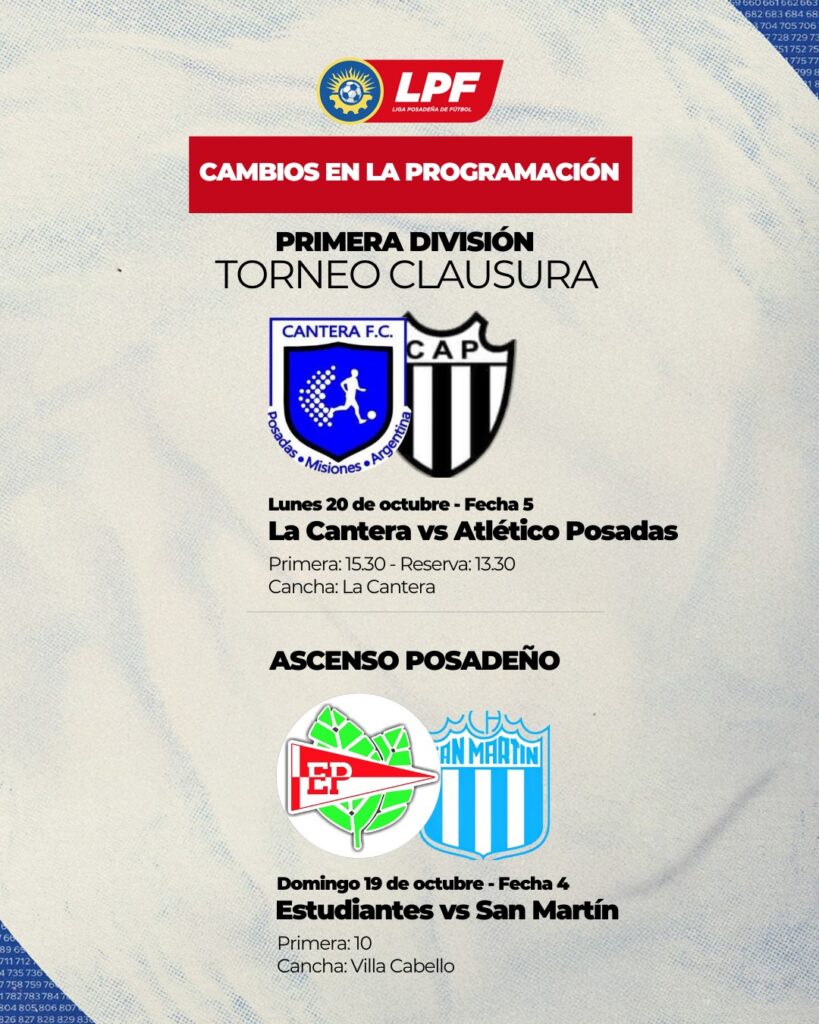 La organización de la Liga Posadeña confirmó modificaciones en el cronograma de la quinta fecha. El encuentro entre La Cantera y Atlético Posadas se adelantó al lunes, mientras que el duelo entre Estudiantes y San Martín, previsto inicialmente para el viernes, fue reprogramado para el domingo por la mañana.