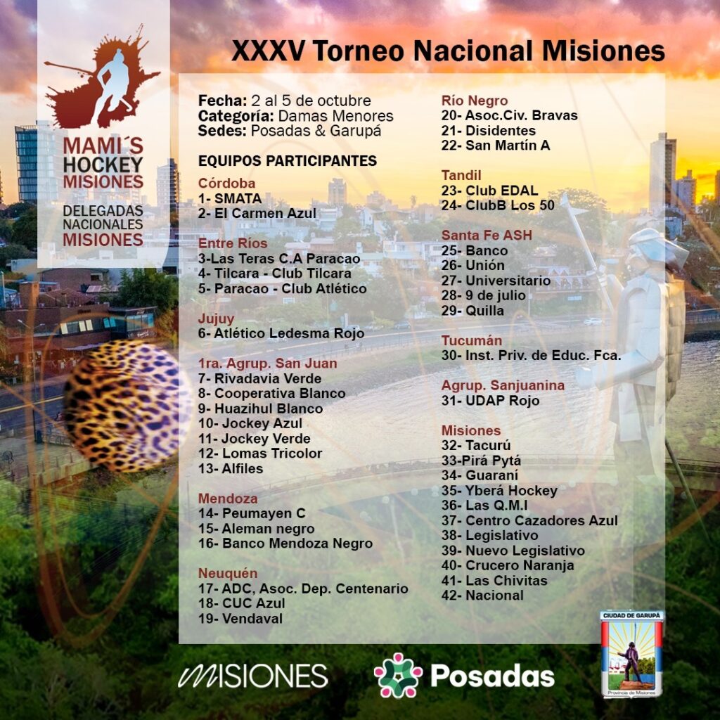 Este miércoles 24 de septiembre se realizará la presentación oficial del Torneo Nacional Damas Menores edición XXXV y del Torneo Re Mamis 2025 (+55) edición III, organizados por la delegación nacional de Mami’s Hockey de Misiones. La actividad tendrá lugar en el salón de las Dos Constituciones de la Cámara de Representantes de Misiones, desde las 9 h.