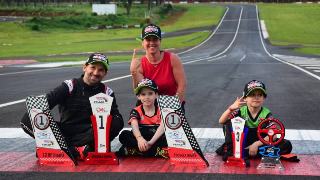 En la categoría 13 HP, Adrián Silveira logró su primera victoria oficial. Tras quedarse con la pole y la serie, se impuso en la final y celebró junto a sus hijos, mecánicos y equipo. “No lo podía creer. Valentino ganó las dos finales, Thiago su primer podio y yo pude redondear con pole, serie y final. Solo tengo palabras de agradecimiento”, destacó Adrián.