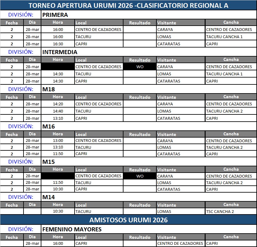 En cancha de Tacurú, donde Gustavo Visser será juez principal, secundado por Sanabria y Casco, el local recibirá a Lomas, en uno de los partidos más atrayentes de la fecha. Tacurú fue soprendido por un Cataratas, que le discutió en el terreno más virtuoso que tiene la hormiga, el de los tres cuartos y se mostró más resolutivo en las formaciones fijas, donde limpió mejor la salida de la guinda. Lomas viene con el ánimo en alza producto de la victoria como visitante en Eldorado y tratará de repetir su actitud para posicionarse en el torneo.