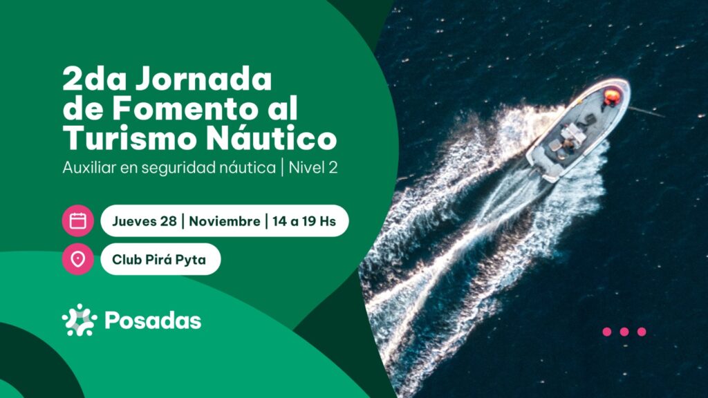 La Secretaría de Turismo y Desarrollo Económico de la Municipalidad de Posadas invita a la 2° Jornada de Fomento al Turismo Náutico, bajo el lema «Gestión del Turismo Náutico: Auxiliar en Seguridad Náutica y Gestión Empresarial». Se llevará a cabo el jueves 28 de noviembre, de 14 a 19h, en el Club de Pesca y Náutica Pirá Pytá.