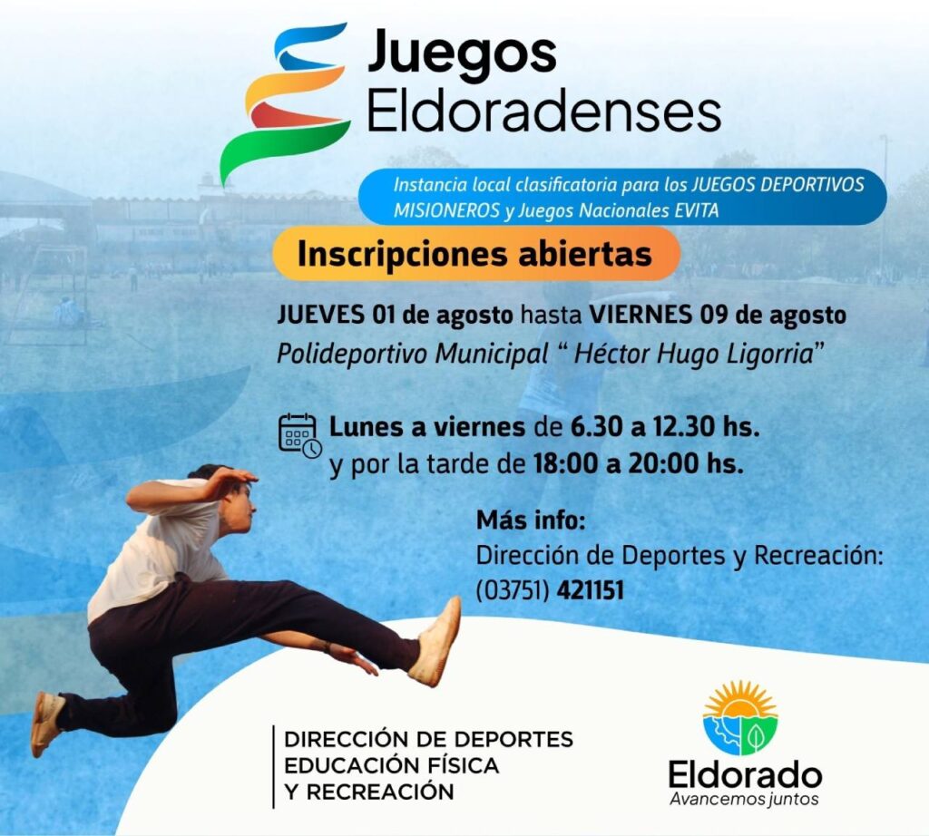 La Dirección de Deportes y Recreación de la Municipalidad de Eldorado informa que ya está abierta la inscripción para participar de los Juegos Eldoradenses 2024, la instancia local clasificatoria para los Juegos Deportivos Misioneros y Juegos Nacionales Evita.