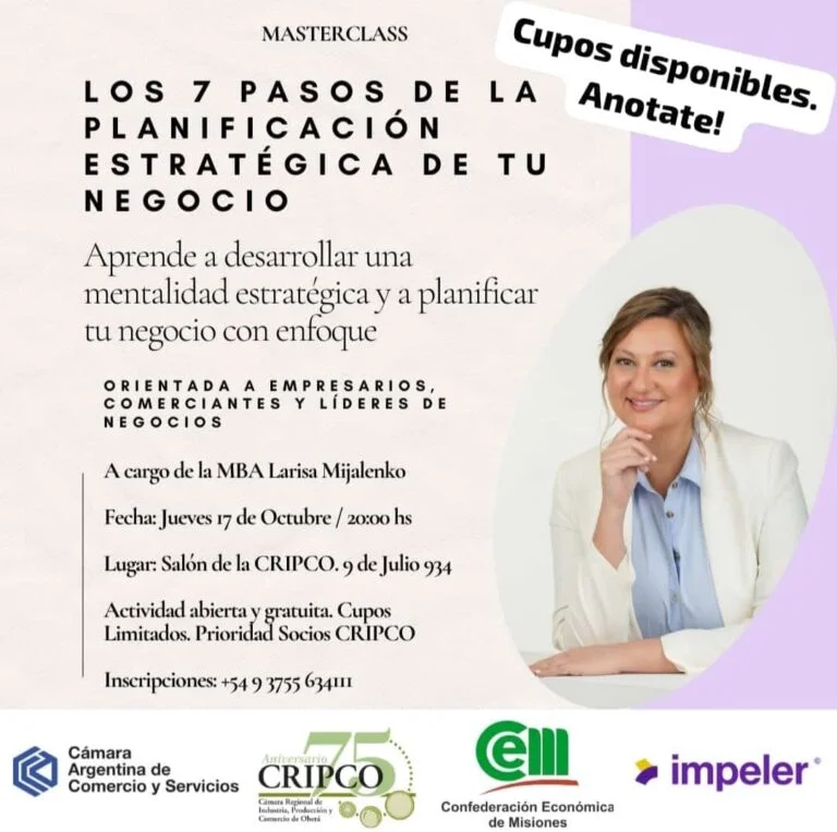 El próximo jueves 17 de octubre a las 20h, se llevará a cabo el taller titulado «Los 7 Pasos de la Planificación Estratégica de Tu Negocio», organizado por la Cámara Regional de Industria, Producción y Comercio de Oberá. La actividad será impartida por la MBA Larisa Mijalenko, reconocida por su experiencia en el ámbito empresarial.