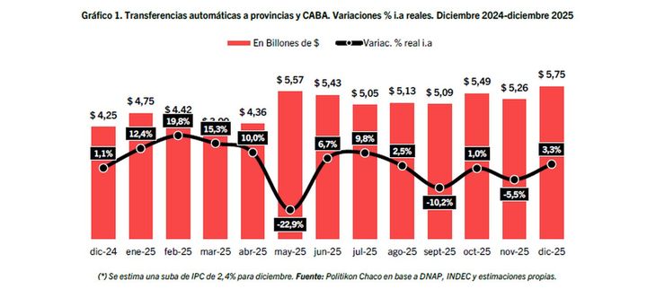 En espejo, las transferencias automáticas crecieron en el último mes del año. Según datos de la consultora Politikon Chaco, los envíos por coparticipación alcanzaron los $5.124.079 millones y exhiben una variación real de +0,1% interanual., además de un crecimiento de 2,6% en la comparación mensual.