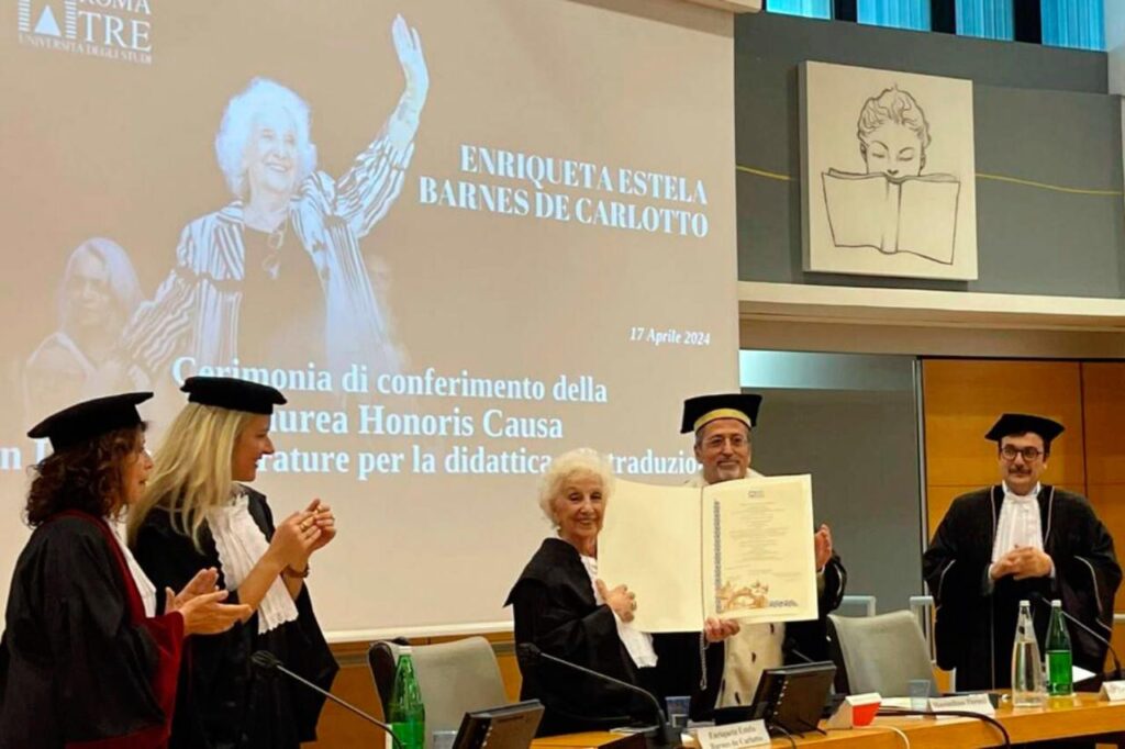 La presidenta de Abuelas de Plaza de Mayo, Estela de Carlotto, recibió en Italia la investidura como doctora honoris causa que le entregó la Università degli Studi di Roma Tre, “por su compromiso cívico, humano y cultural”.