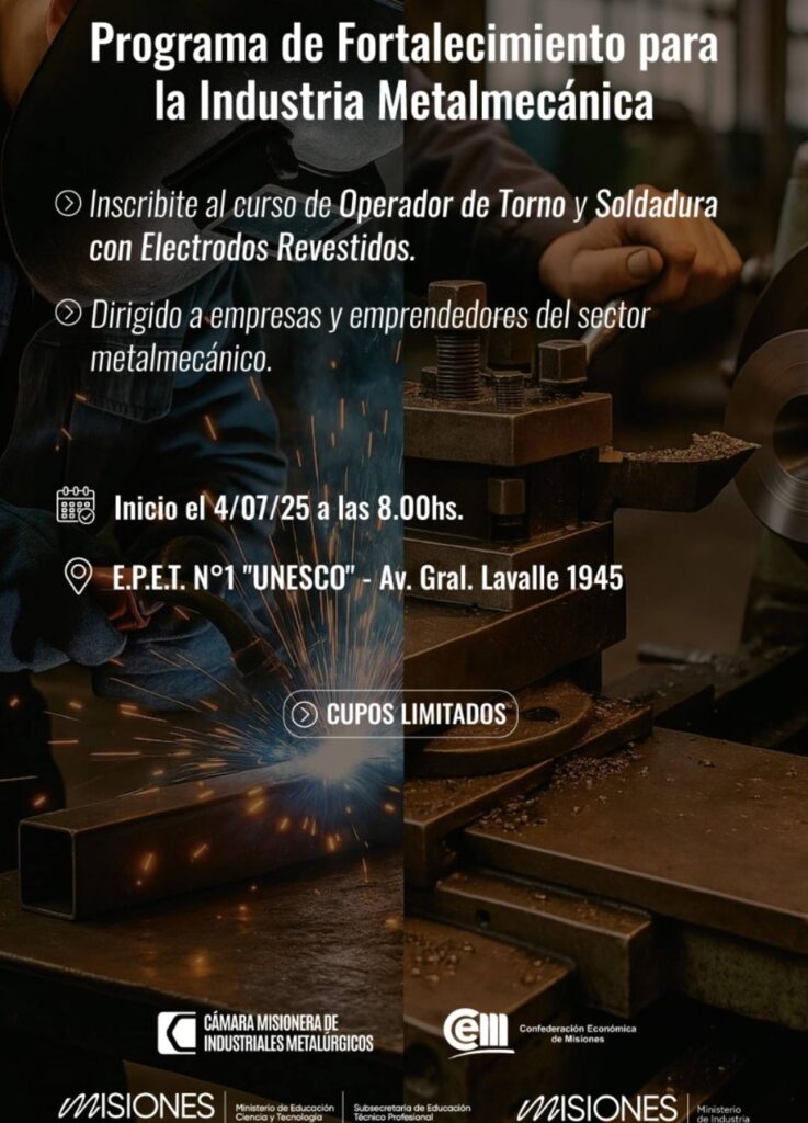 El Ministerio de Industria de la provincia, junto con la Cámara Misionera de Industriales Metalúrgicos y la Confederación Económica de Misiones, lanza una nueva edición del Programa de Fortalecimiento para la Industria Metalmecánica, una iniciativa pensada para capacitar y fortalecer al sector productivo local. En esta ocasión, se encuentra abierta la inscripción para el curso de Operador de Torno y Soldadura con Electrodos Revestidos, destinado a empresas y emprendedores del rubro metalmecánico. La formación se dictará en la E.P.E.T. N.º 1 «UNESCO», ubicada en Av. Gral. Lavalle 1945, y se desarrollará durante seis jornadas intensivas, todos los días viernes entre el 4 de julio y el 29 de agosto, en el horario de 8:00 a 17:00 hs, con una pausa para el almuerzo.
