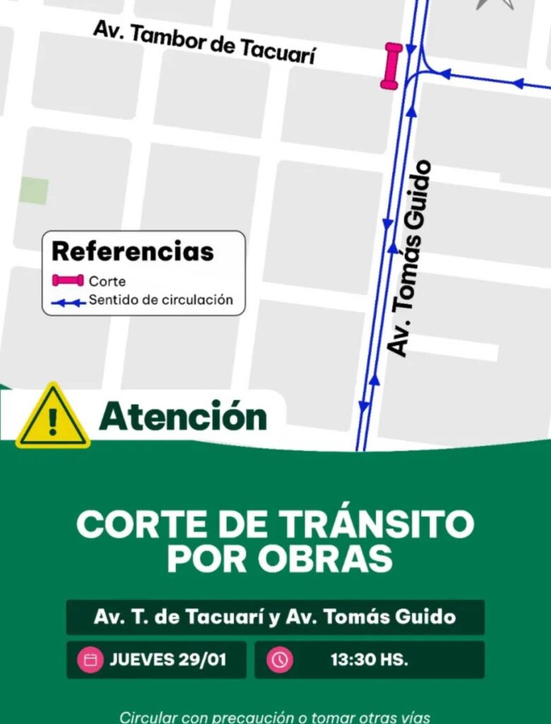 Desde hoy, aunque con algunas intermitencias debido a la lluvia, La Municipalidad de Posadas informó que desde hoy se lleva a cabo un corte de tránsito en la intersección de las avenidas Tambor de Tacuarí y Tomás Guido, debido a la ejecución de obras en el sector.
