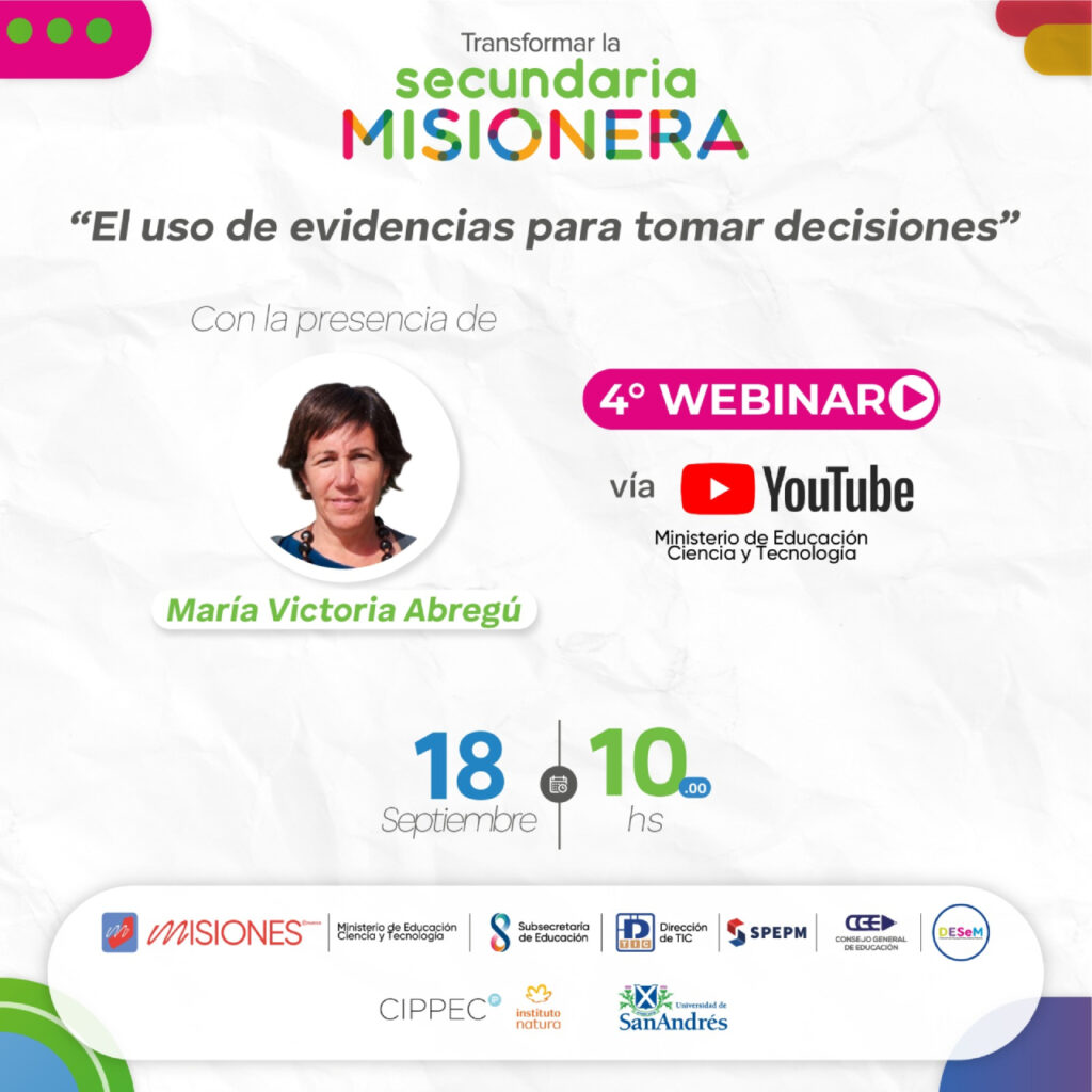 Dentro del marco de la Política de Transformación del Secundario Misionero, la reconocida especialista en educación, María Victoria Abregú disertará en el 4° webinar de este año. Los docentes, directivos, equipos de gestión e interesados podrán ingresar a la charla a través de la página de youtube de Ministerio de Educación en donde podrán realizar preguntas tras la exposición de la magister en gestión educativa. Será el 18 de septiembre a las 10 hs.