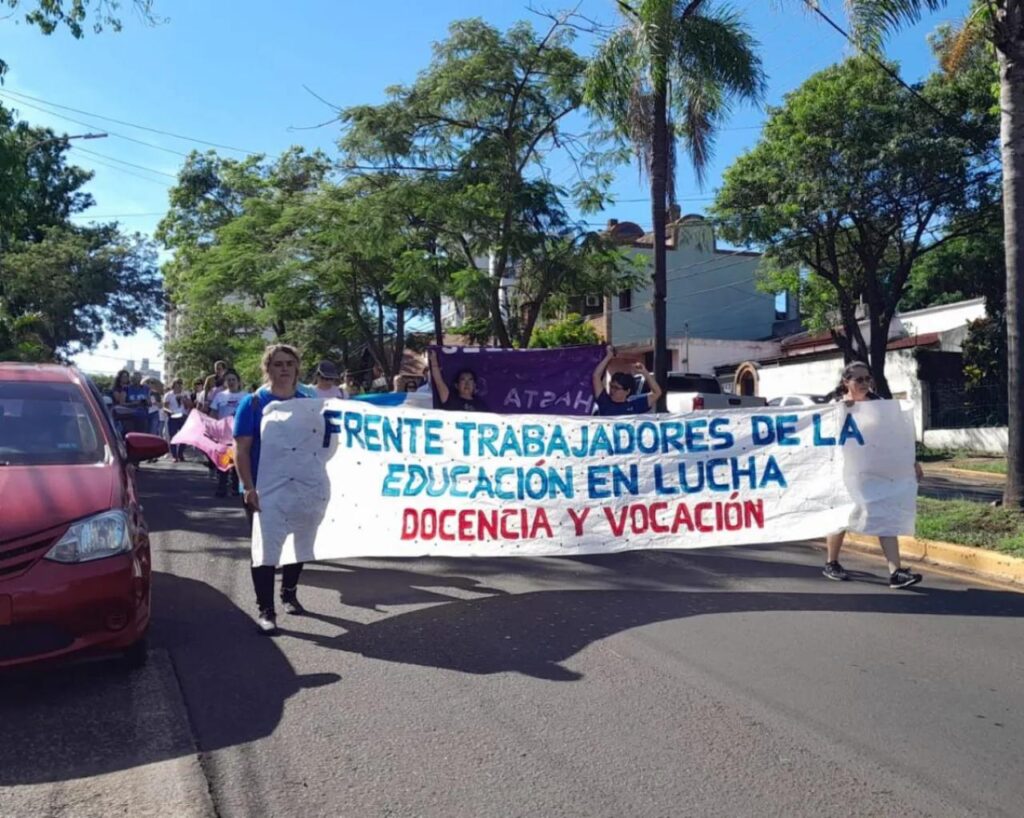 Los trabajadores nucleados en el FTEL continuaron con hoy con la serie de medidas de fuerza destinadas a reclamar y visibilizar la situación de los docentes y de la educación en Misiones. Tras agruparse en Urquiza y Corrientes por la mañana, marcharon a la sede del Consejo General de Educación portando pancartas y carteles en los que demostraban las razones del reclamo. La medida se replicó en otros puntos de la propvincia con docentes marchando con carteles.