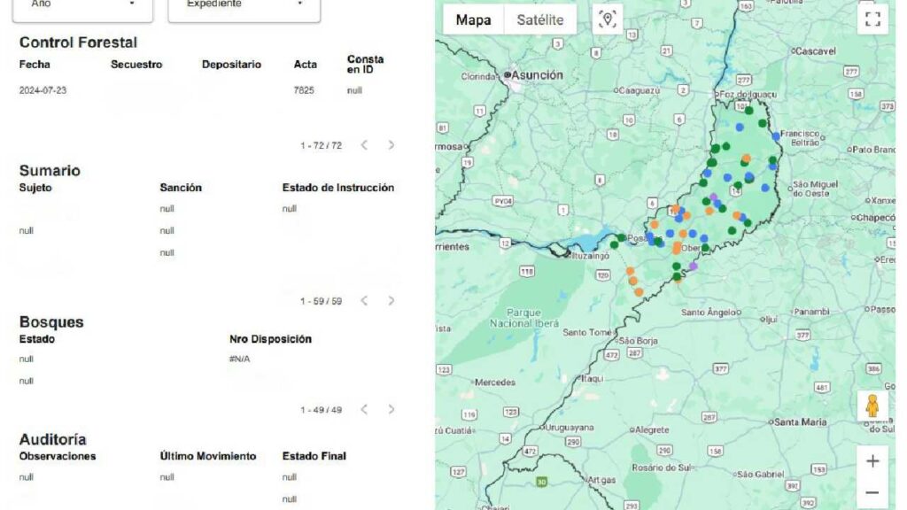 El Sistema de Auditoría integra, en una única plataforma interna, los datos generados por la Dirección de Control, la Dirección de Sumarios y la Dirección de Bosques. Allí se unifica información sobre bienes extraídos sin autorización (madera en distintas presentaciones, tablas, rollizos, troncos) y también vehículos, maquinaria pesada, camiones, camionetas, motosierras, aserraderos portátiles y herramientas retenidas en procedimientos de fiscalización. Este registro permite realizar un seguimiento completo y verificable desde el secuestro preventivo hasta la resolución administrativa: restitución, sanción económica, compensación ambiental, donación o destino alternativo.