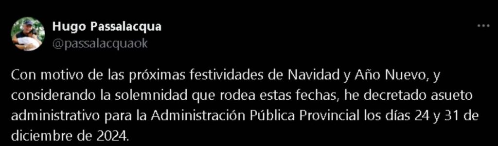 El gobernador Hugo Passalacqua declaró asueto administrativo para la administración pública provincial los días 24 y 31 de diciembre de 2024. Según detalla el decreto, que también lleva la firma del ministro de Coordinación General de Gabinete, Héctor Llera, el objetivo de este asueto es fortalecer los vínculos familiares, permitiendo que los trabajadores de la administración pública de Misiones puedan celebrar las fiestas de la Navidad y de Año Nuevo junto a sus seres queridos.