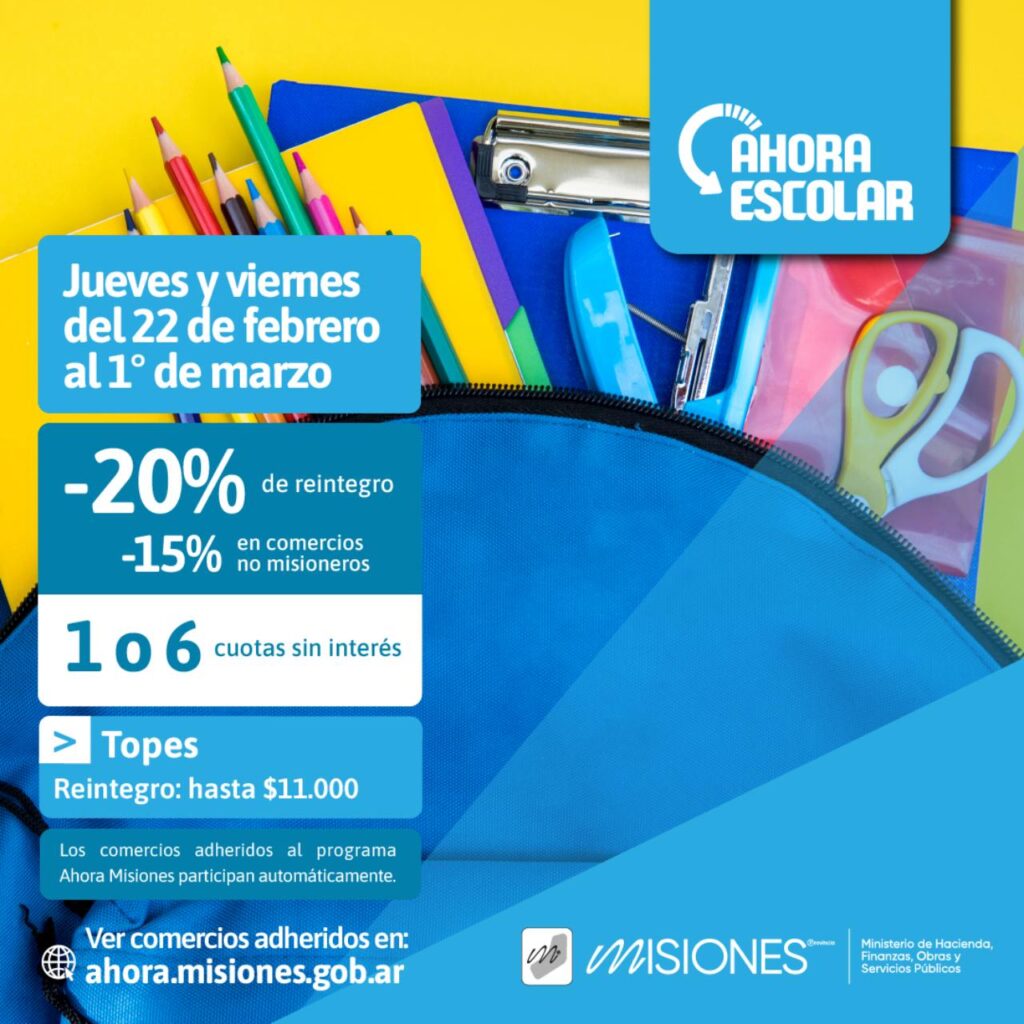 Hoy finalizará la edición 2024 del programa Ahora Escolar, y comenzará a funcionar el programa Ahora Texto, impulsados ambos por el Gobierno de Misiones con el objetivo de acompañar a las familias misioneras en el comienzo del ciclo lectivo 2024 para la compra de útiles, uniformes e indumentaria deportiva para los estudiantes, con reintegros y cuotas sin interés.