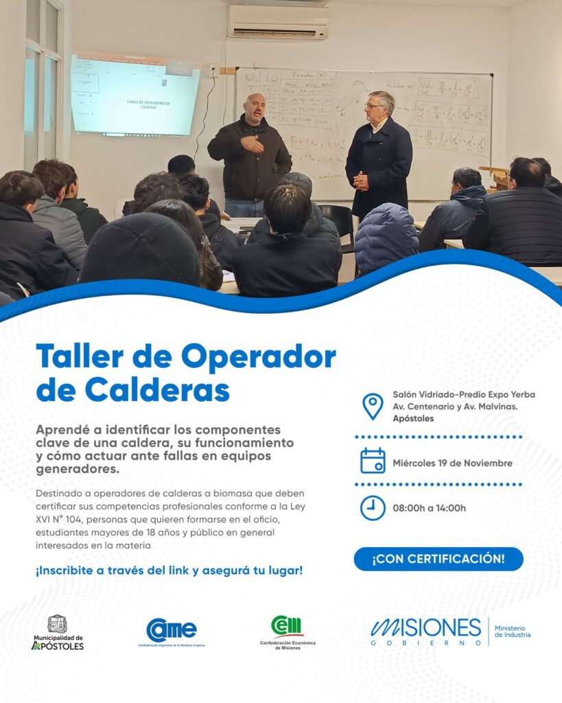El próximo miércoles 19 de noviembre, el Ministerio de Industria de Misiones dictará el Taller de Operador de Calderas en la ciudad de Apóstoles, una propuesta de formación destinada a operadores, técnicos y público en general interesados en adquirir conocimientos sobre el funcionamiento de calderas a biomasa.