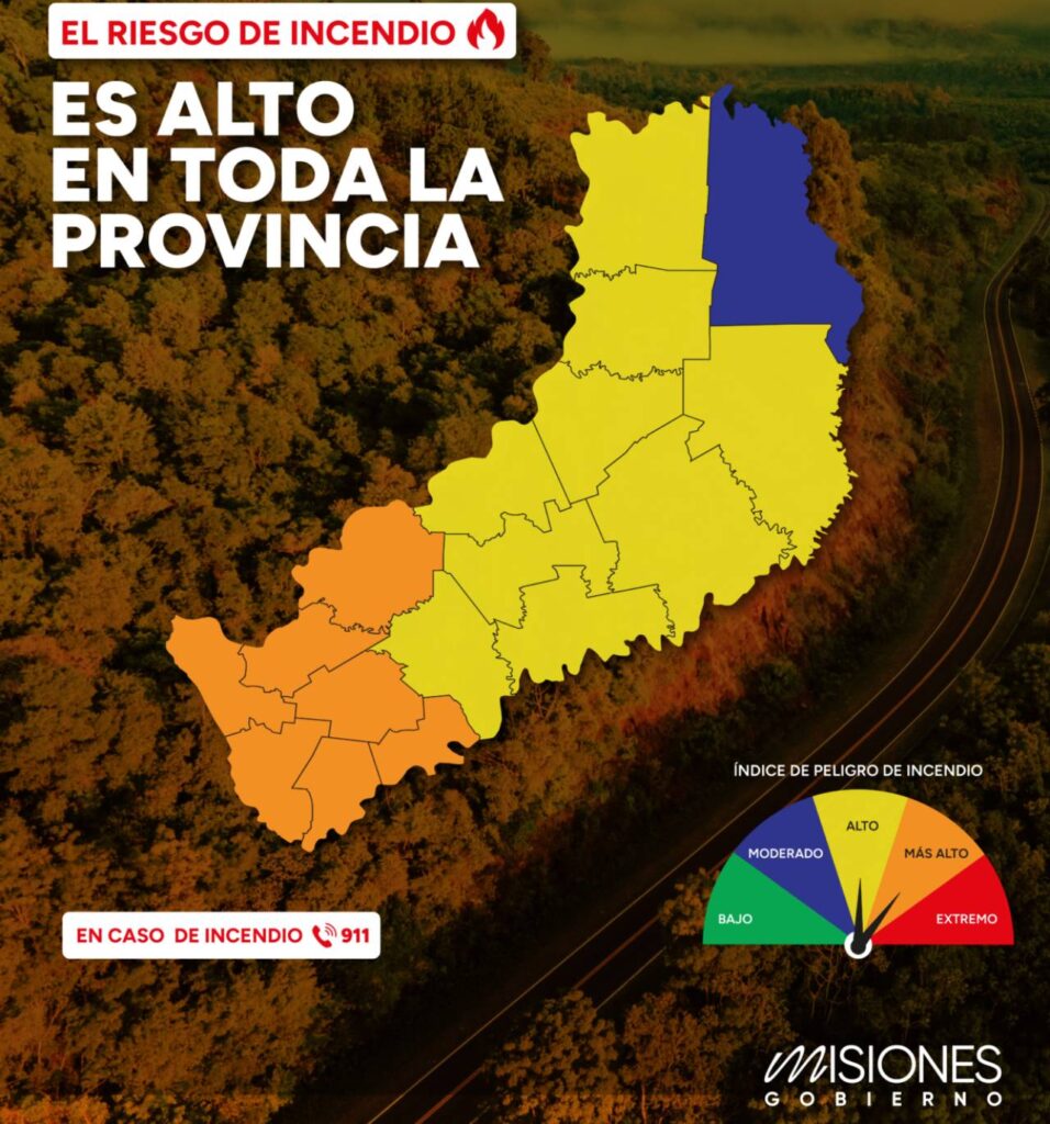La Dirección de Alerta Temprana advirtió en su reporte diario un alto índice de riesgos por incendios, especialmente en zonas de pastizales y montes bajos de Misiones. Esto sobre todo en los departamentos de la zona sur de la provincia como Apóstoles, Candelaria, Capital, Concepción, Leandro N. Alem, San Ignacio, San Javier, que están bajo un riesgo muy alto de incendio. El resto de las divisiones departamentales de la zona centro y norte figuran en el índice bajo la categoría de riesgo alto, a excepción del distrito de General Manuel Belgrano que se encuentra con riesgo moderado.