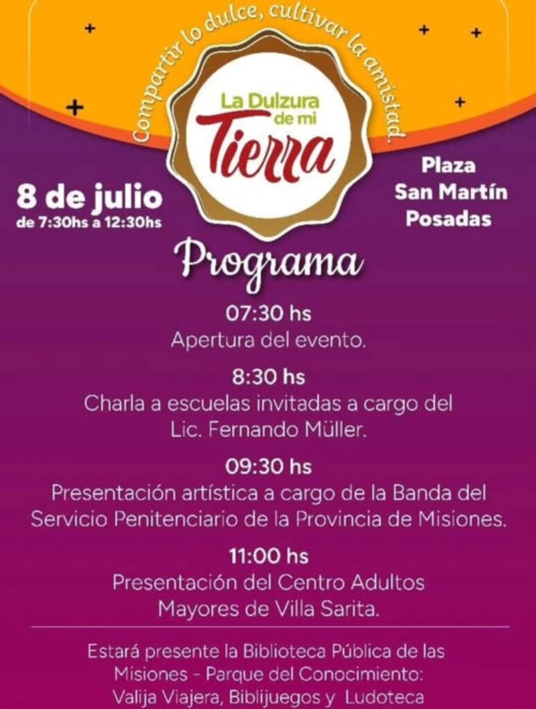 Mañana 8 de julio se realizará una nueva edición de la feria Plaza Dulce “La Dulzura de mi Tierra”, impulsada por el Ministerio de Agricultura Familiar. La actividad se llevará a cabo de 7:30 a 12:30 en la Plaza San Martín de Posadas, con la participación de productores locales y una agenda que incluye charlas, espectáculos y presentaciones culturales.