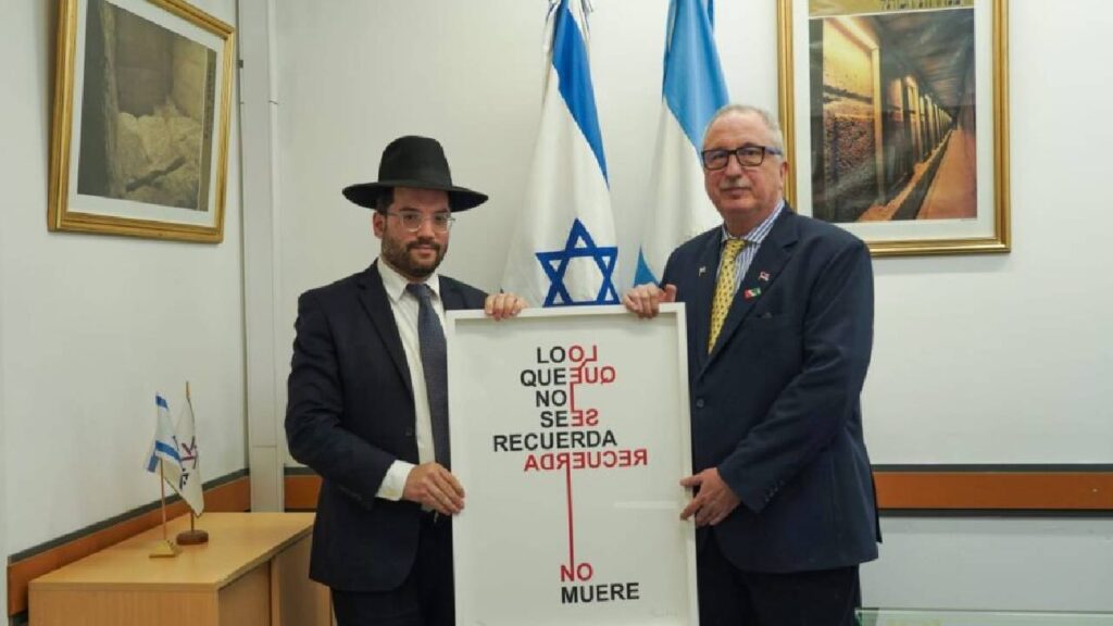Tras el homenaje, el gobernador mantuvo un encuentro con el rabino Eliahu Hamra, quien lo invitó a firmar la declaración conjunta por la memoria y la justicia. Este documento fue firmado por los gobernadores de todo el país durante el Encuentro Federal por la Memoria, realizado el 25 de junio pasado.