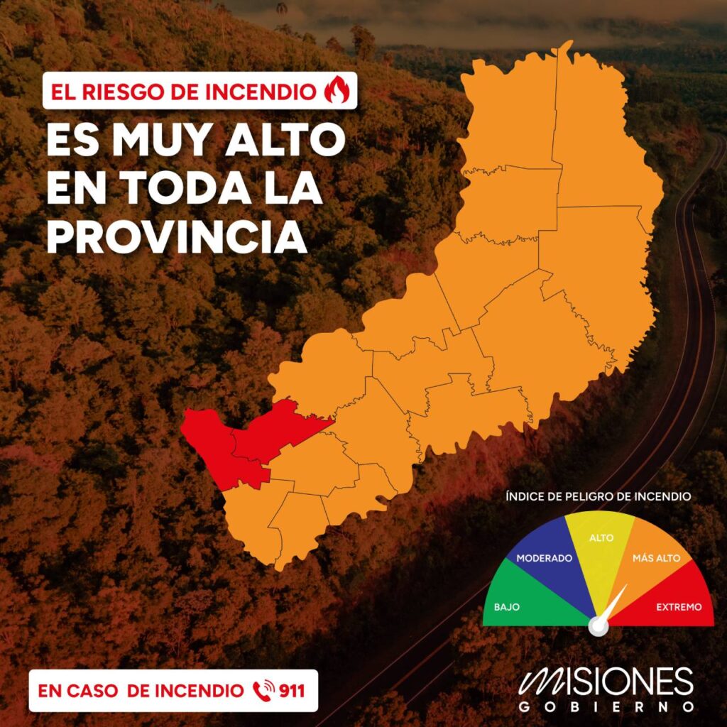 La Dirección de Alerta Temprana informó que 15 departamentos de Misiones se encuentran bajo riesgo “ALTO” de incendios forestales, mientras que las jurisdicciones de Capital y Candelaria presentan riesgo “EXTREMO”. Ante este panorama, el Gobierno provincial reiteró la necesidad de adoptar medidas preventivas para evitar siniestros.