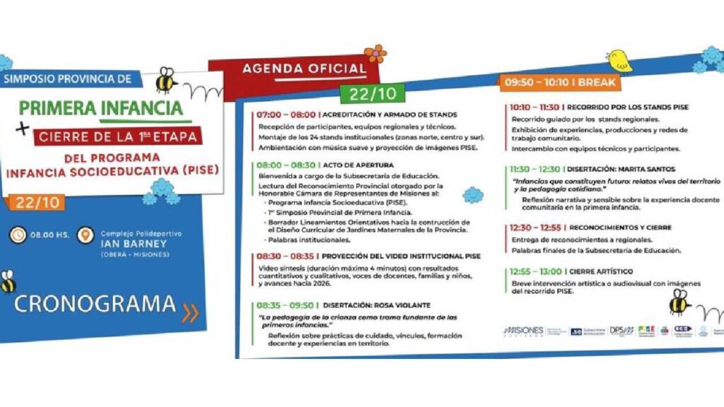 Mañana se realizará en Oberá el 1° Simposio de Primera Infancia más el Cierre de la etapa del programa Infancia Socioeducativa (PISE), bajo la consigna «Infancias que construyen futuro». El encuentro, es organizado por la subsecretaría de Educación, con la colaboración de la Municipalidad de Oberá y tendrá lugar desde las 8, en el Complejo Polideportivo Ian Barney.