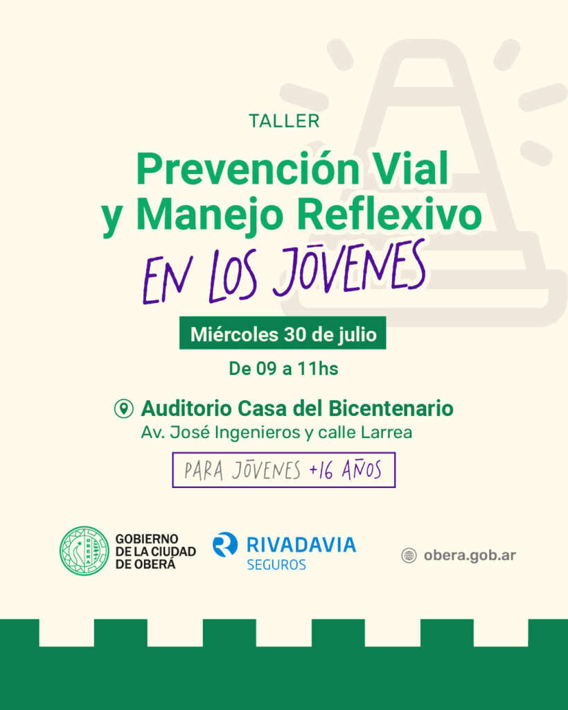 La Dirección de Tránsito y Seguridad vial invita el próximo miércoles 30 de julio, de 9:00 a 11:00 hs, se realizará en el auditorio de la Casa del Bicentenario (Av. José Ingenieros y Larrea) un taller de seguridad vial dirigida a jóvenes a partir de los 16 años. La actividad es gratuita y está orientada a fomentar una conducción responsable y consciente entre los futuros conductores.