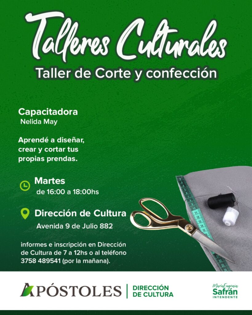 La Dirección de Cultura de la Municipalidad de Apóstoles informa a los vecinos y comunidad en general que están vigentes los distintos Talleres dependientes del Municipio para que los vecinos puedan llevar adelante las capacitaciones y actividades que elijan de acuerdo a sus prioridades, preferencias o intereses.