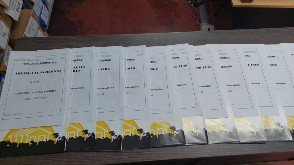 Un total de 12 familias de colonos que habitan en el Paraje Fray Luis Beltrán, en la conocida como Colonia Bananera de la localidad de El Soberbio, recibirán las escrituras de las tierras en las que viven y producen.