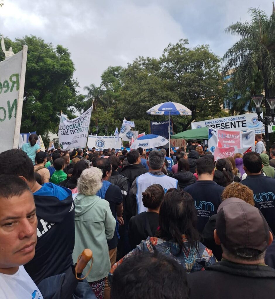 La lluvia, intermitente a veces, con más intensidad en otras, no fue impedimento para la concentración en la plaza 9 de Julio en reclamo de mayor presupuesto para las universidades y en defensa de la educación pública y gratuita. Estudiantes, docentes, personal no docente, egresados, organizaciones sociales, sindicatos y partidos políticos, además de algunas familias fueron parte de la convocatoria
