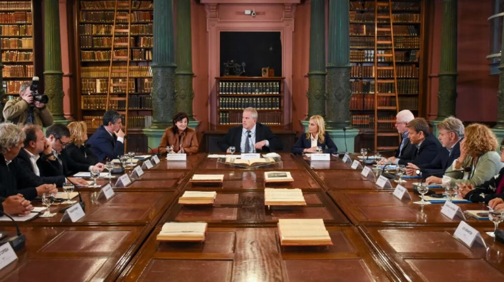 Del encuentro, que se realizó en la Biblioteca Nacional de Maestras y Maestros (BNM) del Palacio Sarmiento, participaron también la ministra de Trabajo, Raquel “Kelly” Olmos y representantes de CTERA, UDA, CEA, SADOP y AMET.