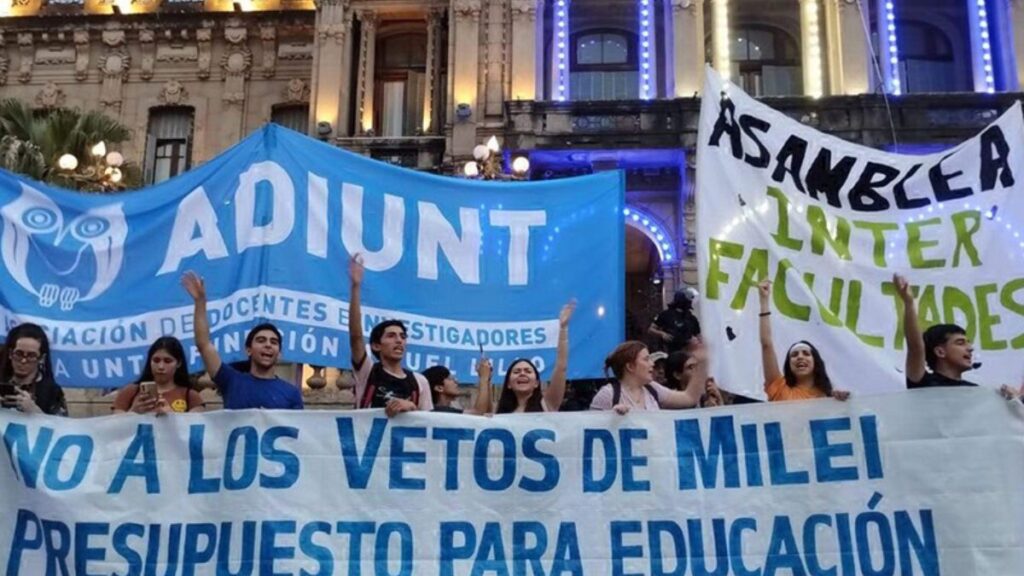 Ayer se realizó el paro nacional universitario con una adhesión del 95 por ciento en todo el país, es el primero de los tres que definió el Frente Sindical, integrado por diferentes gremios en reclamo a la apertura de paritarias y en protesta por el veto. Además, en facultades de varias provincias como Mendoza, San Luis, La Pampa, Misiones y Corrientes, entre otras, se hicieron actividades para visibilizar el conflicto con el Gobierno Nacional, que se niega a rever su postura y escala en los ataques verbales. En Tucumán, estudiantes y docentes hicieron clases públicas y una movilización masiva a Plaza Independencia para repudiar la violencia de la policía provincial, que el miércoles desalojó una clase con el aval del gobernador Osvaldo Jaldo.