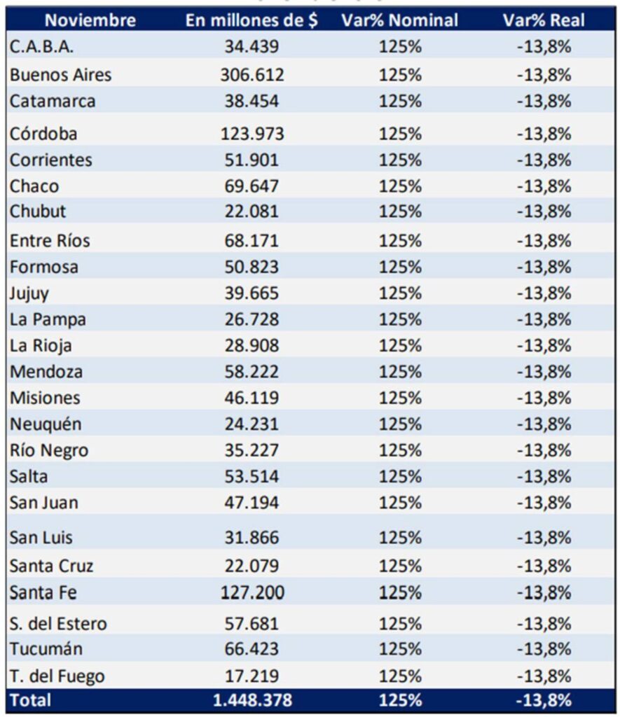 En concepto de coparticipación, en noviembre de 2023, el Gobierno nacional envió al consolidado de provincias más CABA $1.448.000 millones, frente a $642.000 millones enviados durante igual período del año anterior.