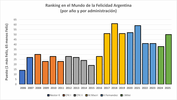 Antes de que la gente de la Oficina de Respuesta Oficial me acuse de “opositor”, “zurdo” o váyase a saber qué otra cosa, vale la aclaración que durante los dos primeros años de la gestión de Alberto Fernández fuimos en promedio, según el WHR, mucho menos felices que en lo que va de la administración Milei (puesto 56 frente al 44). Claro que esto empalidece frente al primer bienio de Macri, puesto 40, y especialmente a los de Cristina Kirchner 28 a 2013 y 27 a 2009.
