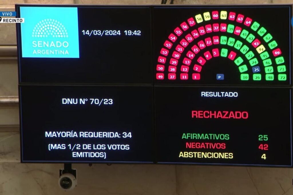 La definición del mega DNU pasa ahora a Diputados, que parte de una base de al menos 110 votos a favor del rechazo. Ni bien sea informada de la votación de este jueves, la Cámara baja podrá debatirlo en el recinto, pese a que la idea del oficialismo es encontrar una salida y estirar la discusión a través de la bicameral de Trámite Legislativo, que analiza este tipo de normas.